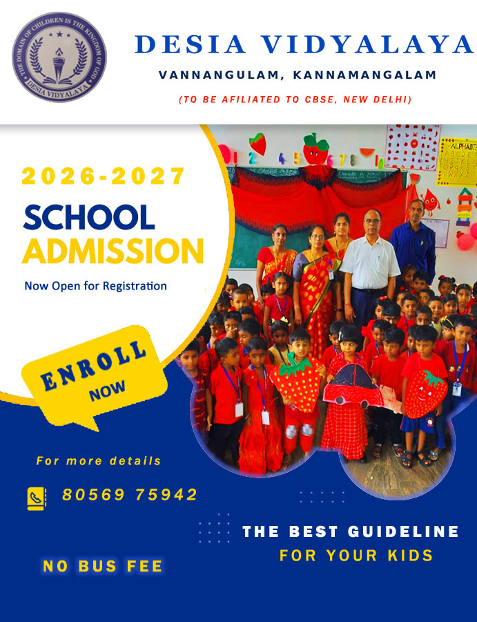 is a reputed school run by Desia Vidyalaya the Group of School in the district of Aarani & Vellore district. The school is located in the town of Vannankulam, Kannamangalam. The school was established in 2024. Our School offers rainbow of learning programmes with world class education within your reach. The approach to education is inquiry based, collaborating and learning socially, project based learning with interdisciplinary and multidisciplinary aspects reflect global perception in the school learning. Beyond curriculum we ensure holistic development of the children to mould them to be an accomplished human being. Focus is on extracurricular activities also. Conductive atmosphere at our school prepare the children to face the challenges in the 21st century and make them creators. At our school children will have the freedom of learning according to their wish and taste, so that they will become an independent learner.